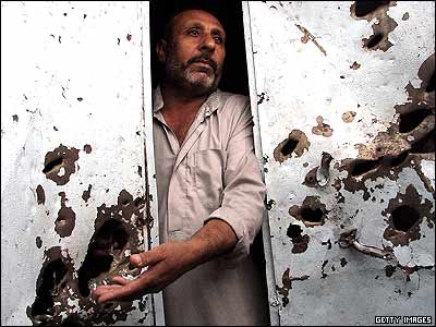 يک مرد عراقی ساکن شهرک صدر بغداد، صدمه ای را که در جريان يک درگيری به منزلش وارد شده به همسايگان نشان می دهد. سربازان عراقی و آمريکايی در ساعات اوليه بامداد امروز به اهدافی در اين منطقه شيعه نشين يورش بردند.