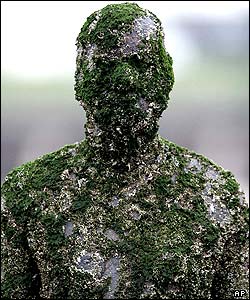 يکی از صد مجسمه ای که آنتونی گورملی مجسمه ساز بريتانيايی در چيدمان هنری ای با عنوان 'جايی ديگر' به کار برده است. اين مجسمه ها که همگی به سوی دريا چشم دوخته اند در يکی از سواحل شهر ليورپول انگلستان چيده شده اند. |