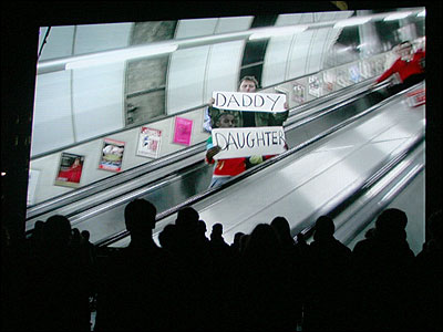 زنی به فکر خودکشی در رود تيمز. برخی فيلمها سياه و سفيد فيلمبرداری شده بودند که عمدتا جنبه های تلخ تر زندگی در لندن را بازگو می کردند. يکی از فيلمها زن جوانی را نشان می داد که نيمه شب در يکی از محلات پست شهر گير افتاده، روسپی ها دورش را گرفته اند و دو پسر نوجوان ترانه رپ Businesswoman را خطاب به او می خوانند |