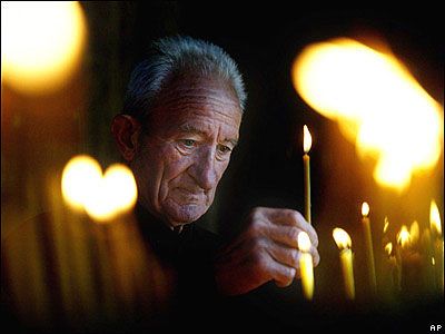 مردی از اهالی صربستان در حال روشن کردن شمعی در کلیسا. رای دهندگان در صربستان به پای صندوقهای رای رفتند تا به قانون اساسی جدیدی رای دهند که کزوو را جزو جداناشدنی این کشور به حساب می آورد.