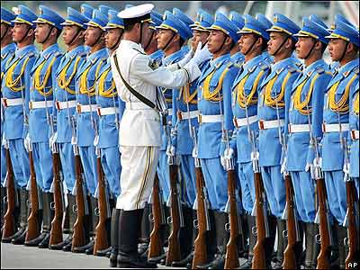نیروهای گارد ویژه تشریفات ارتش چین در فرودگاه آماده استقبال از سران کشورهايی هستند که برای شرکت در اجلاس همکاری کشورهای آسیای جنوب شرقی 'آسه آن' به چين سفر می کنند.