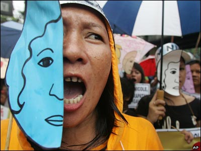 تظاهرات ضد آمریکایی در مانیل پایتخت فلیپین. این تظاهرات در پی انتشار گزارشهایی پیرامون تجاوز جنسی به زنی فلیپینی توسط یک سرباز آمریکایی صورت گرفت.