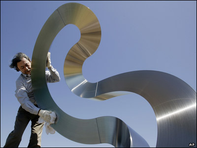 هنرمند ژاپنی، ميتسوئو تاکيوچی، در حال صيقل دادن اثر خود به نام "تجلی باد"، که در نمايشگاهی در سيدنی به نمايش درخواهد آمد.