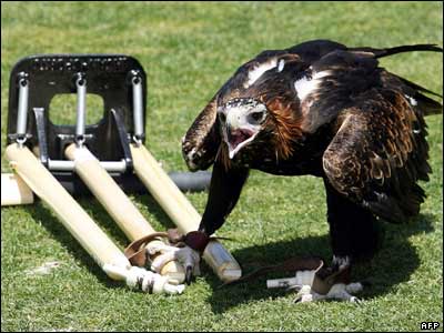 در جريان تصويربرداری برای تبليغ مسابقات کريکت سيدنی، يک عقاب چوب کريکت را محکم نگه داشته است.