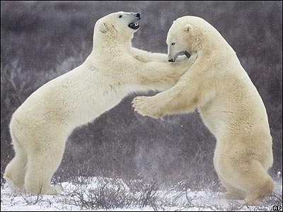 دو خرس قطبی در حال بازی کردن در دشتهای يخزده اطراف شهر چرچيل در ايالت مانيتوبای کانادا.