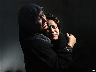 عزاداری دو زن فلسطينی در مراسم تشييع جنازه دو برادر جوان فلسطينی که روز جمعه در جريان حمله اسراييل به شهر بيت لاهيه در شمال نوار غزه کشته شدند.