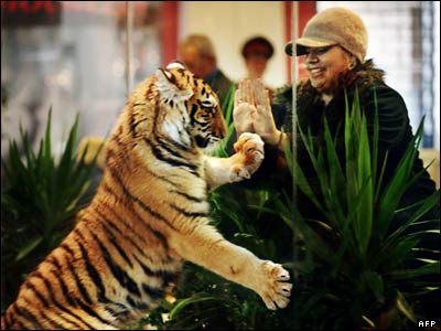 ببر هشت ماهه ای که برای يک برنامه تبليغاتی به مرکز خريدی در صوفيه پايتخت بلغارستان آورده شده است.