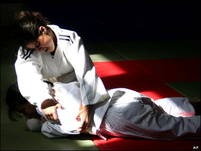 صحنه ای از مسابقه جودو زنان در شهر کابل پايتخت افغانستان.