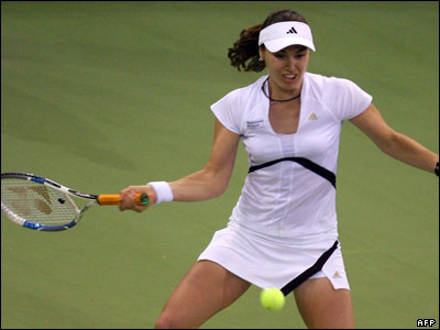 مارتينا هيگيس تنيس باز سوييسی در حال مسابقه با ناديا پترووا از روسيه در مسابقات قهرمانی مادريد.
