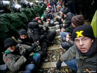 معترضين به برنامه های اتمی در جهان يک خط راه آهن درنزديکی شهر هيتزاکر آلمان را مسدود کرده اند. اين اعتراضات همزمان با انتقال زباله های اتمی از آلمان به فرانسه صورت می گيرد.