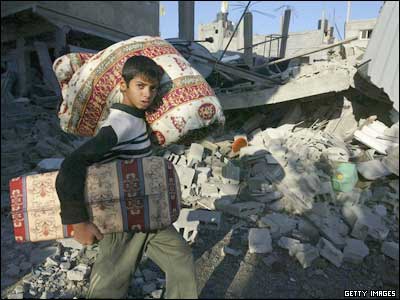 کودک فلسطینی پس از حمله هوایی ارتش اسراییل به نوار غزه، وسایلی را که در لابه لای آوار يک خانه باقی مانده، جمع آوری می کند.