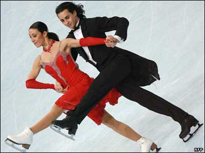 دو رقصنده ایتالیایی در حال اجرای اسکیت روی یخ در جريان مسابقه ای در پاریس.