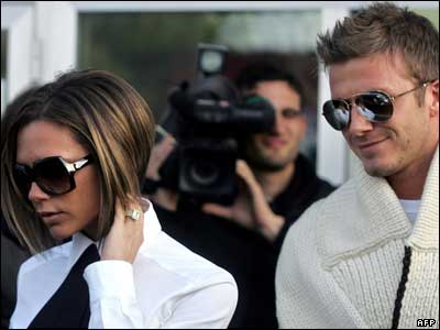 ديوید بکهام بازیکن فوتبال رئال مادرید و همسرش ویکتوریا بکهام که برای شرکت در مراسم عروسی تام کروز و کيتی هلمز، بازیگران هالیوود، به شهر بارسینا در ایتالیا رفته اند.