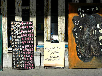 آثار نقاش دوره گرد در تهران در کنار تابلوی رعايت سکوت