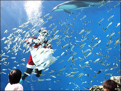 یک غواص زن با لباس بابانوئل در آکواریومی در یوکوهامای ژاپن. این اقدام به منظور جلب بازدیدکنندگان بيشتر به این آکواریوم صورت گرفته است.