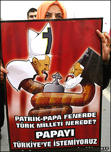 امروز در استانبول ترکيه تظاهراتی بر عليه پاپ بنديک شانزدهم رهبر کاتوليکهای جهان برگزار شد. اين تظاهرات که توسط 'حزب ترکيه بزرگ' سازماندهی شده پيشاپيش ديدار پاپ از ترکيه برگزار شد. در عکس فوق يک ملی گرای ترک پلاکاردی را در دست گرفته که روی آن نوشته شده:'پاپ در (محله) فنر (استانبول)، ملت ترک کجاست؟ پاپ را در ترکيه نمی خواهيم.'