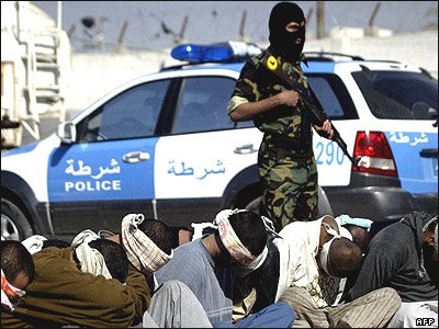 گروهی از افراد مظنون به فعاليتهای تروريستی که توسط ماموران امنيتی عراق دستگير شده اند.