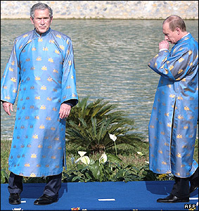 جورج بوش رييس جمهور آمريکا و ولاديمير پوتين رييس جمهور روسيه با لباس سنتی ويتنامی در جريان اجلاس سران کشورهای عضو سازمان همکاريهای اقتصادی کشورهای آسيا و حوزه اقيانوس آرام - اپک - در ويتنام.