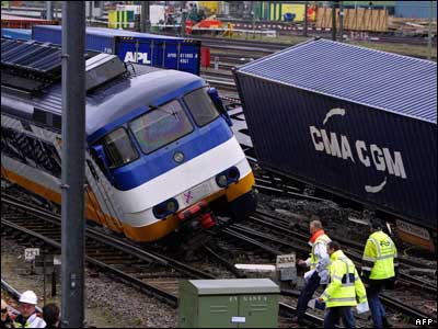 صحنه ای از برخورد قطار سریع مسافری با یک قطار باری در روتردام هلند
