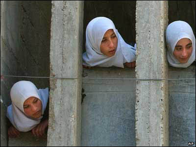 دختران مدرسه ای در خانه یک پيکارجويان فلسطينی در نوار غزه که برای جلوگیری از حمله نیروی هوایی اسرائيل سپر انسانی تشکیل داده اند. |