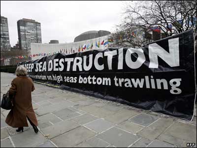 پارچه ای نصب شده توسط فعالان محیط زیست مبنی بر جلوگیری از صید ماهی بوسیله تورهایی که بر کف دریا کشیده می شوند. قرار است که این هفته قعطنامه ای در سازمان ملل تصویب شود که بر اساس آن کف دریاها به عنوان مناطق حفاظت شده اعلام شوند