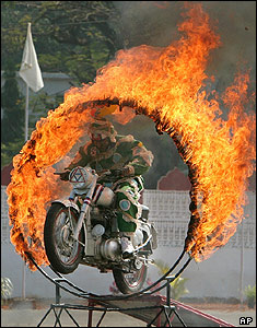 یک بدلکار هندی در حال پرش با موتور از میان حلقه آتش.