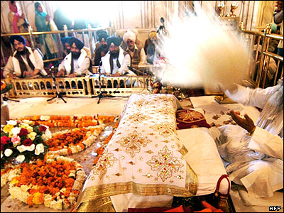 تعدادی از سیکهای هندی مشغول انجام مراسم مذهبی خود در معبد آمیرتسار در هند.