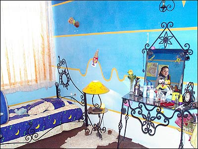 عاشق اتاقم هستم. خودم رنگش کردم. آبی چون رنگ آرامشه. با خط های زرد که نشانه نور خورشید هستن که به اتاقم نفوذ داره. درتمام اتاقم اثری از خورشید هست. با چیزهای ساده مثل نقاشی هام، برگ ها، شیشه های خالی، عروسک ها، گل های کوهی و یا حتی تکه چوبها اتاقم رو تزئین می کنم. اینجا دنیای منه که کس دیگری حاکم بر اون نیست.