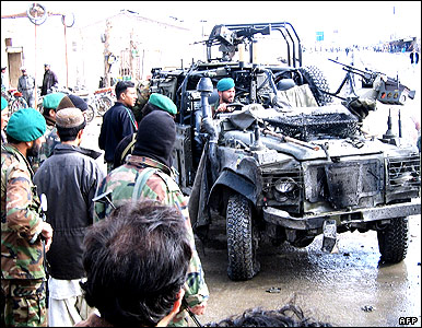 يک پليس افغان سعی دارد خودرویی را که امروز در قندهار هدف يک حمله انتحاری قرارگرفت، از محل حادثه دور کند