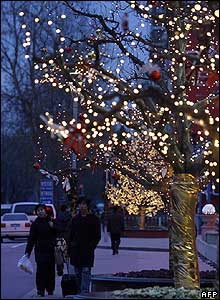 تزئينات درختان خيابان در پکن، مرکز چين در آستانه کريسمس. به شهروندان اين شهر توصيه شده که به دليل آلودگی بيش از حد هوا - که به حدود هفت برابر حد مجاز رسيده است - از منازل خارج نشوند