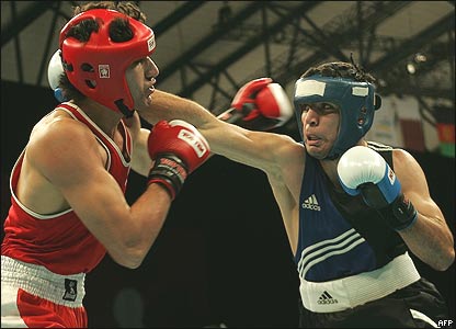 علی مظاهری (سمت چپ)، در مقابل حريف ازبک خود در مسابقه فينال بوکس سنگين وزن 91 کيلوگرم در دوحه. او در اين مسابقه بر حريف ازبک پيروز شد و به مدال طلا دست يافت.