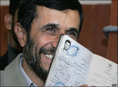 رئيس جمهور ايران پيش از رای دادن شناسنامه اش را به خبرنگاران نشان می دهد. (عکس از بهروز مهری)