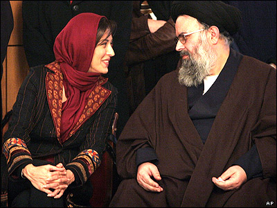 سيد محمد کاظم موسوی بجنوردی رئيس بنياد دايرالمعارف ايران با مهتاب کرامتی سفير حسن نيت صندوق کودکان سازمان ملل در مراسم شصت و مين سالگرد اين بنياد در تهران