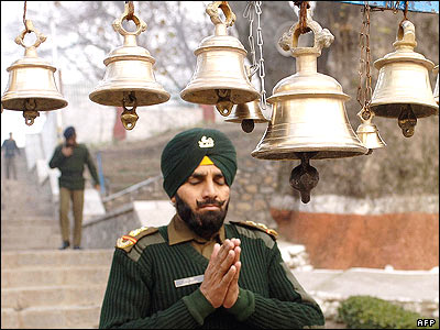 يک افسر ارتش هند پيش از شرکت در مراسم يادبود قربانيان جنگ سال 1971 با پاکستان، در داخل يک معبد دعا می کند. جنگ 9 ماهه نيروهای متشکل از ارتش هند و ارتش آزاديبخش بنگلادش با پاکستان سرانجام با استقلال بنگلادش به پايان رسيد.