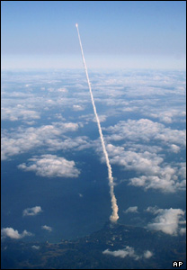 صحنه ای از پرتاب موشکی از داخل یک هواپیما. این موشک که از جنوب ژاپن به فضا پرتاب شد، حامل بزرگترین ماهواره ای است که ژاپن به فضا فرستاده است.