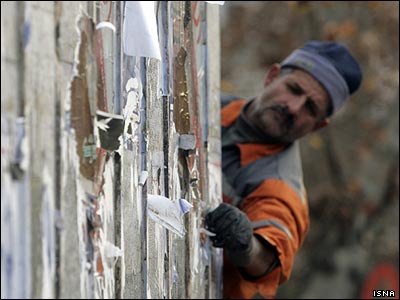 زدودن پوسترهای تبلیغاتی از دیوارهای شهر تهران پس از پايان سه انتخابات همزمان در ايران.