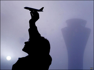 کارمند فرودگاه ادینبورگ در حال نشان دادن ماکت هواپیما. شرکت هوايی "ایزی جت" اعلام کرد که حمل مسافران در سه مسیر جدید هوایی را از این فرودگاه آغاز خواهد کرد.