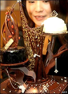 یک فروشگاه در شهر اوزاکا در ژاپن کیکی با قيمتی معادل هشتصد و پنجاه هزار دلار به نمایش گذاشته است. در تزئين اين کيک بیش از صد قطعه الماس بکار رفته است است |