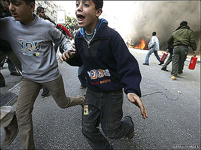 دو پسر فلسطينی در حال فرار در شهر غزه. حماس و فتح دو گروه اصلی فلسطينی، در خيابانهای غزه باهم درگير شدند.