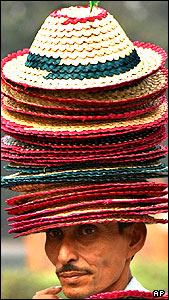 فروشنده دوره گرد در کلکلته هند. قيمت هر يک کلاههای حصيری او کمتر از نيم دلار آمريکا است.