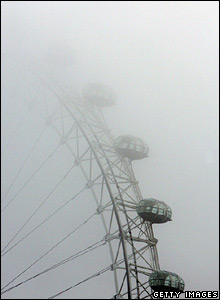 مه غليظ در اطراف چرخ و فلک عظيم موسوم به London Eye که يکی از جاذبه های توريستی لندن به شمار می رود.