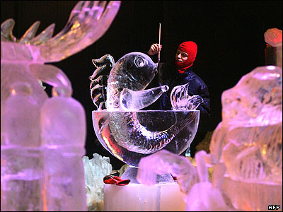 مجسمه ساز اهل لتونی در حال کار کردن روی مجسمه يخی خود در نمايشگاه عصر يخ در شمال شرق آلمان. |