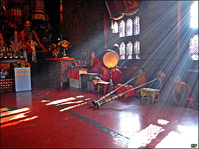 راهبان بودايی در حال نواختن آلات موسيقی سنتی در داخل معبدی در بوتان.