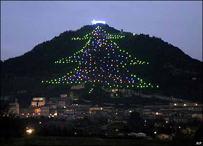 چراغانی بر روی کوه اينجينو در شهر گوبيو، ايتاليا.
