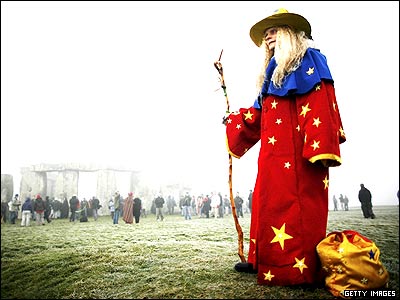 يکی از شرکت کنندگان مراسمی که به مناسبت آغاز فصل زمستان و ختم پائيز در محل بنای تاريخی 'ستون هنج' در بريتانيا برگزار شد. |