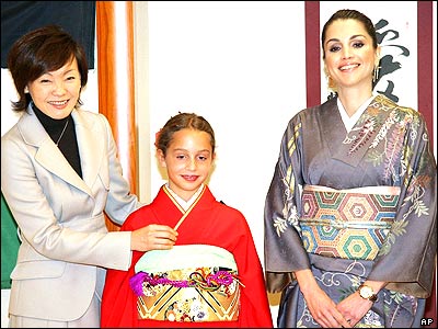 رانيا ملکه اردن و دخترش شاهزاده ايمان در کنار همسر نخست وزير ژاپن در لباس سنتی زنان اين کشور. ملک عبدالله پادشاه اردن به اتفاق همسرش برای يک سفر سه روزه به ژاپن رفته اند.