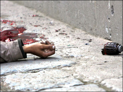 نارنجک منفجر نشده در کنار جسد يکی از جنگجويان مظنون در کشمير تحت کنترل هند. در پنجاه سال اخير کشمير مورد مناقشه هند و پاکستان بوده است.
