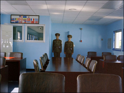 سربازان کره شمالی در مقابل يکی از ميزهايی که مرز بين دو کره را مشخص می کند نگهبانی می دهند. آزمايش هسته ای کره شمالی واکنشهای جهانی را برانگيخت و منجر به اعمال تحريمهای پولی و تسليحاتی از سوی سازمان ملل متحد عليه اين کشور شد.
