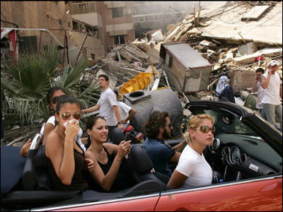 ساکنان بيروت در پی پنج هفته جنگ سنگين بين نيروهای حزب الله و ارتش اسرائيل، از يکی از حومه های جنوبی شهر که تخريب شده می گريزند. جنگ لبنان و اسرائيل در پی ربوده شدن دو سرباز اسرائيلی توسط نيروهای حزب الله شروع شد.