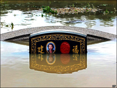 سنگ قبری در چين که در اثر جاری شدن سيلاب زير آب فرو رفته است. در اثر سرازير شدن سيلاب در شرق و جنوب چين تا کنون 97 نفر کشته شده اند و به شهرهای زيادی نيز خسارت وارد شده است.